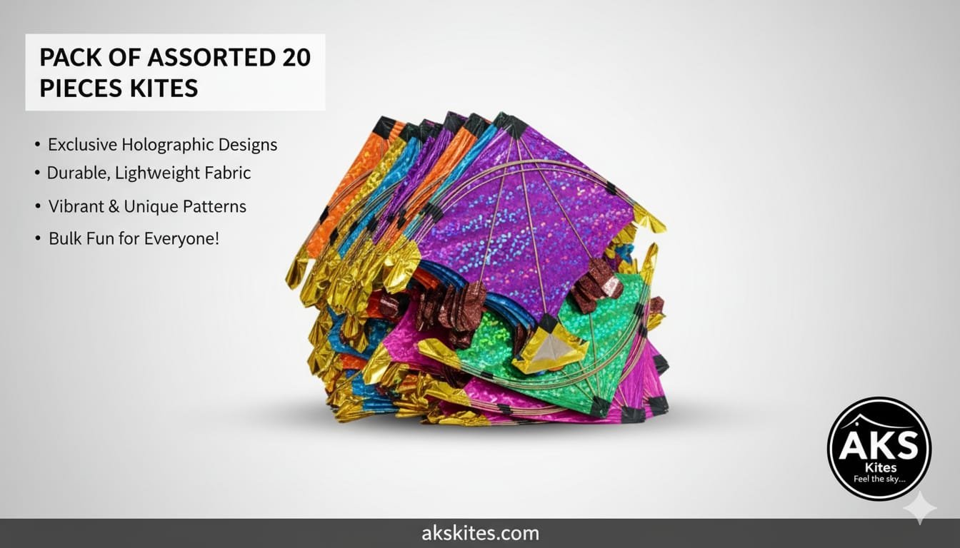 This pack includes 20 eye-catching fancy plastic kites with shiny holographic designs and decorative tails. Made from durable plastic material and strong bamboo sticks, these kites are easy to fly and perfect for both kids and adults. Their vibrant colors and glittering patterns make them stand out beautifully in the sky. Ideal for festivals, parties, and outdoor fun, these kites bring extra excitement to every celebration.
